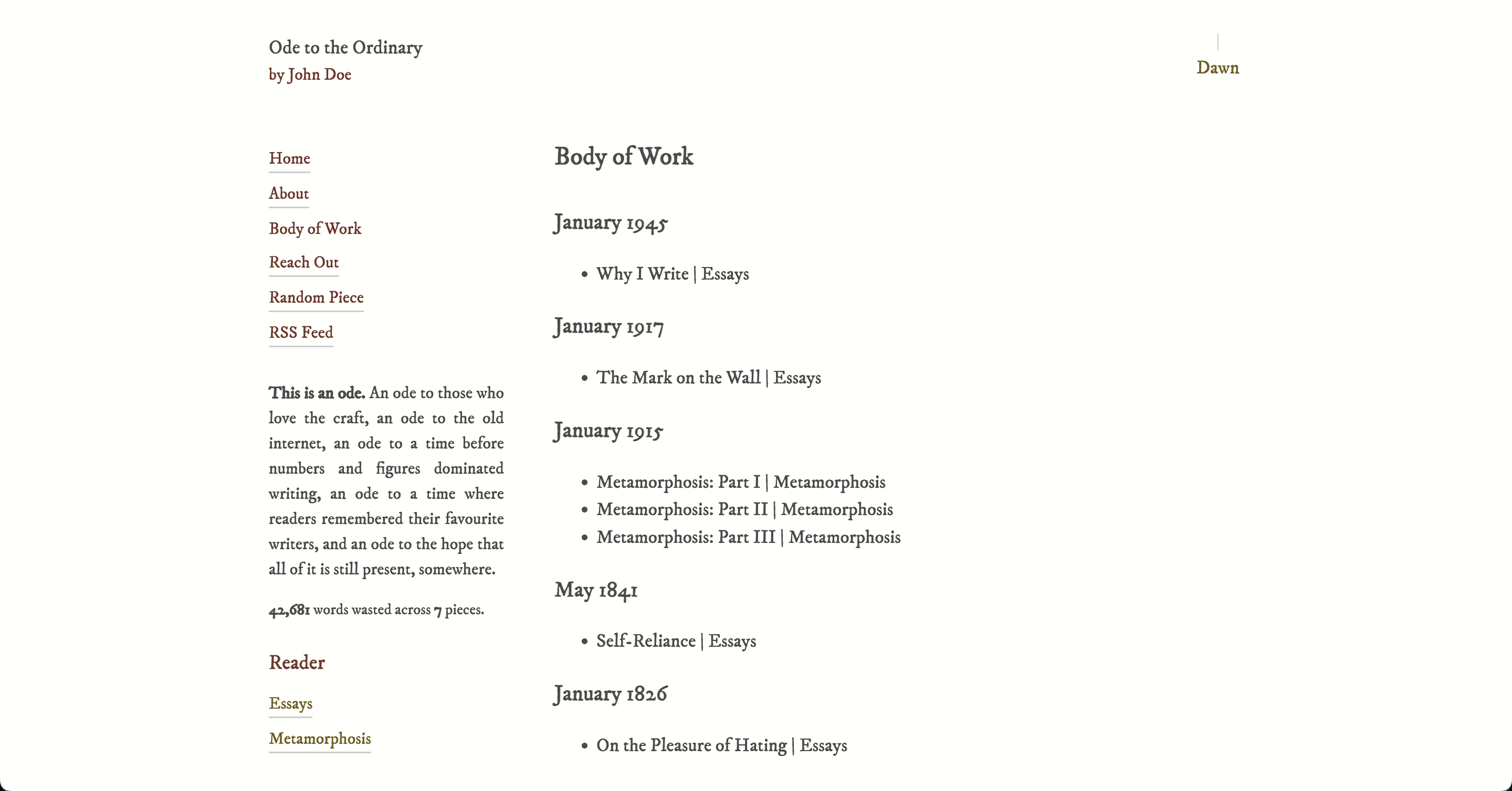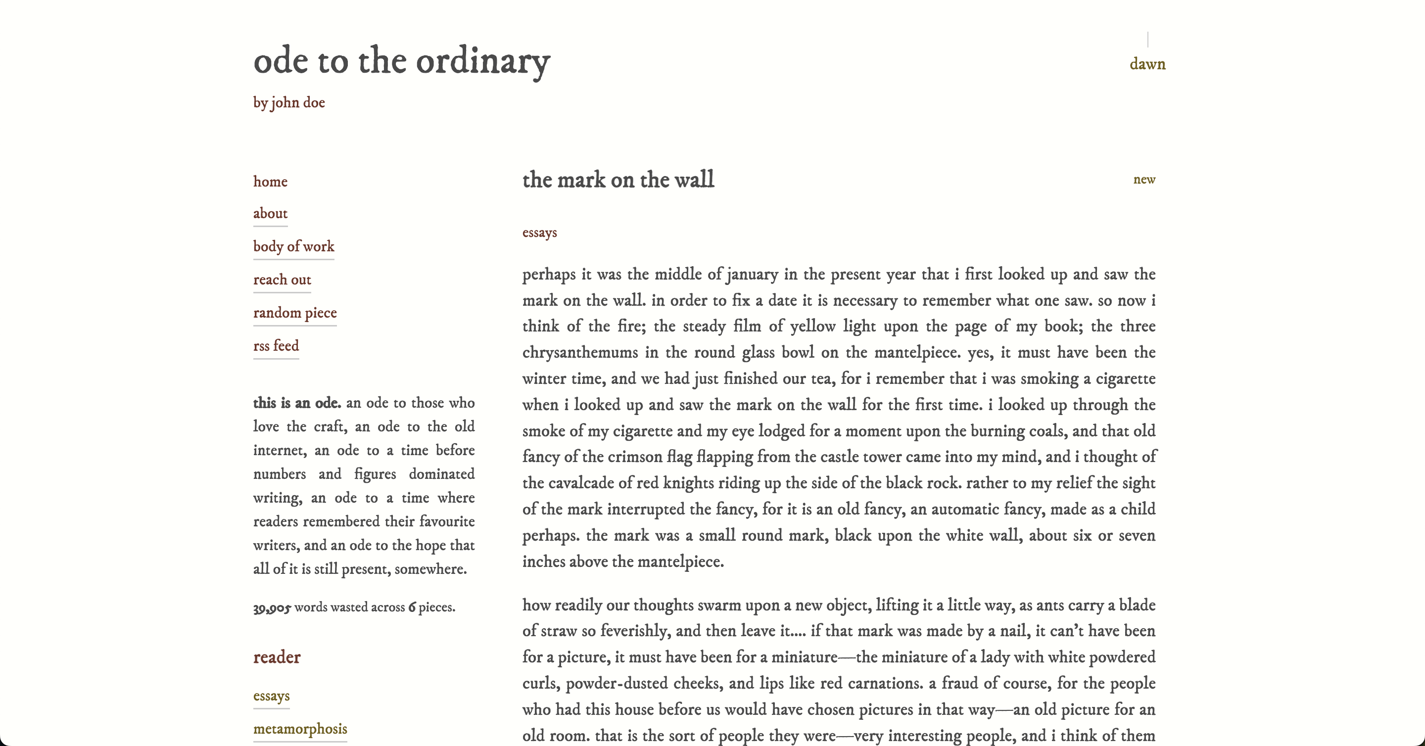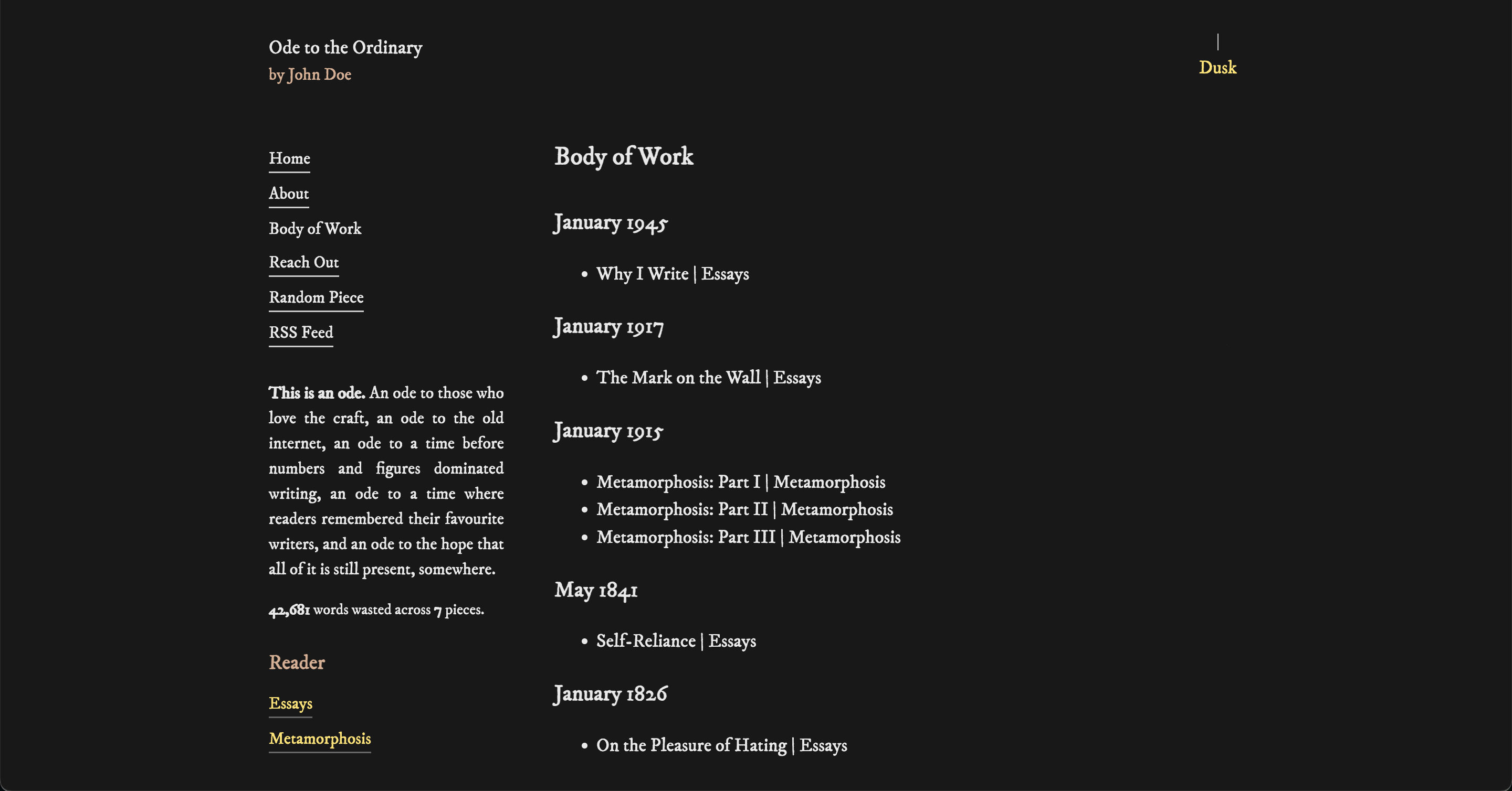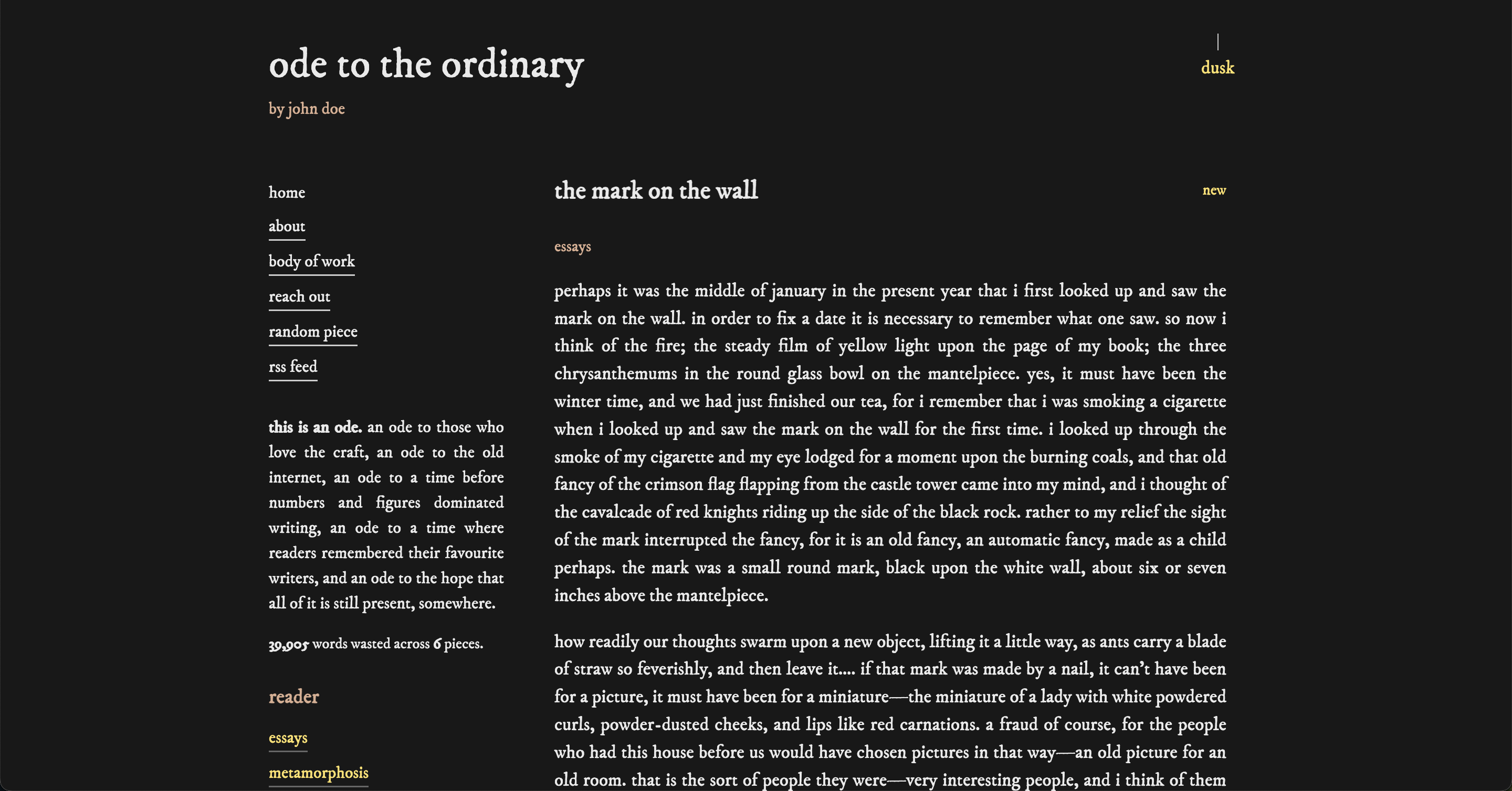 Ode is for writers who want to publish in an aesthetically pleasing website, who ignore the bells and whistles of the modern internet, and who want to create a better experience for their readers. It is opinionated, minimal, and easy to use, guided by its own ethos.