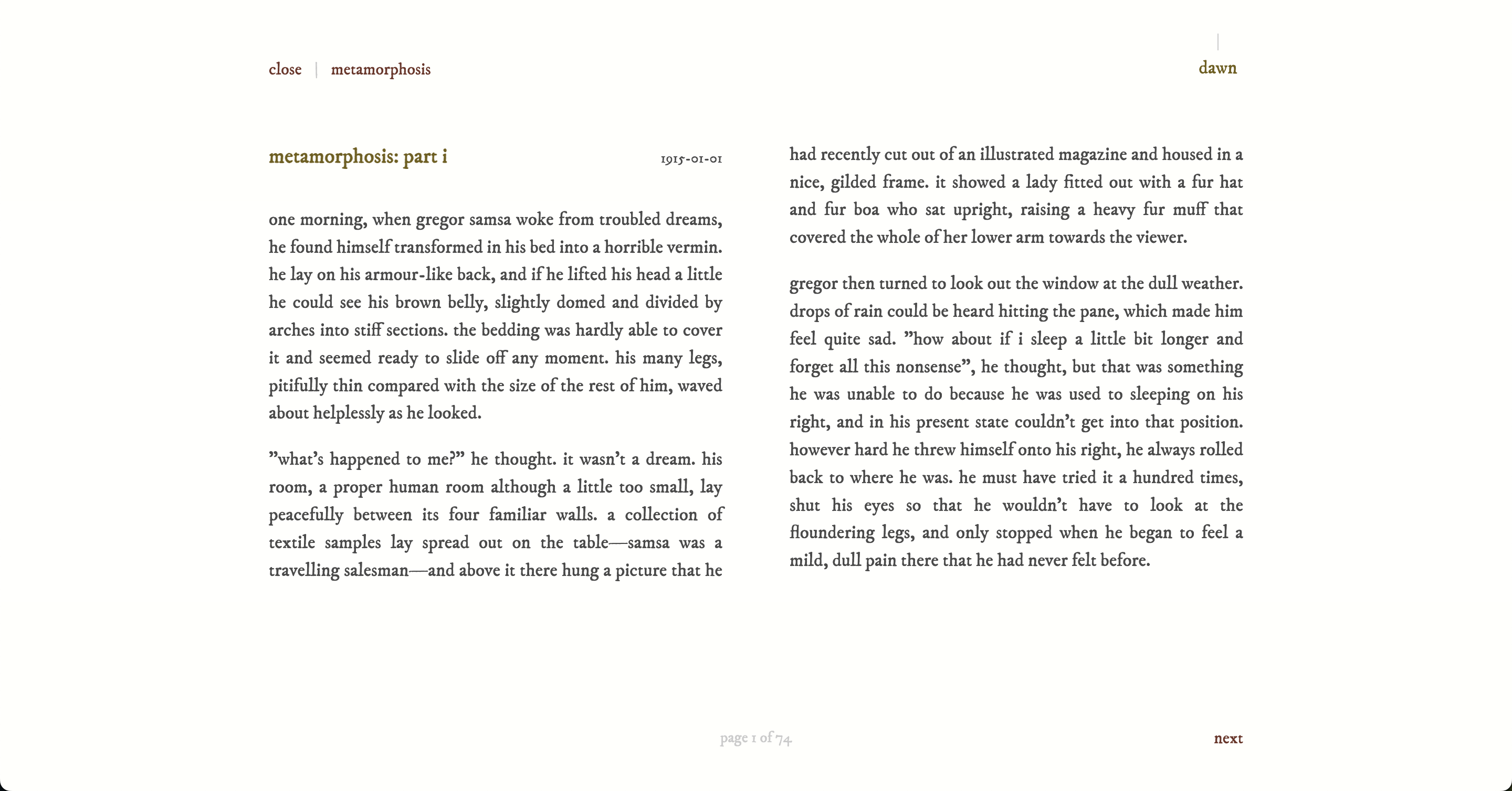 - Reader mode: Beautiful paginated reading experience with keyboard navigation (arrow keys)
